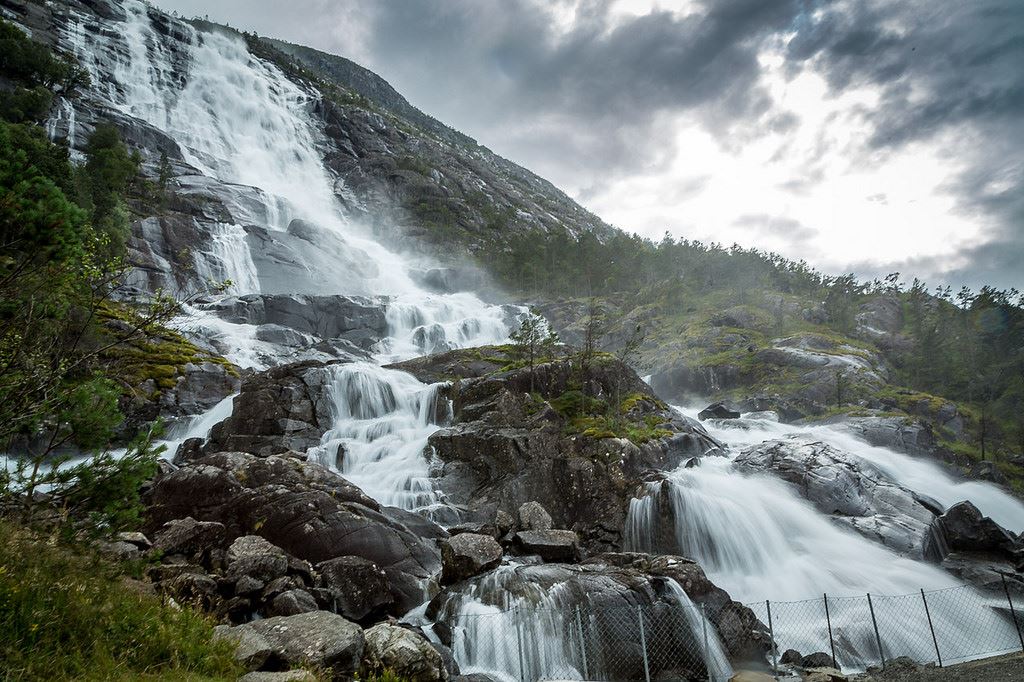 Quella di Langfossen è una cascata situata nel comune di Etne nella contea di Vestland, in Norvegia. La cascata si trova a circa 5 chilometri a sud-ovest del villaggio di Fjæra. L’acqua cade da una montagna imponente, una distanza totale di circa 612 metri prima che l’acqua salti fuori in Åkrafjorden alla base della montagna.