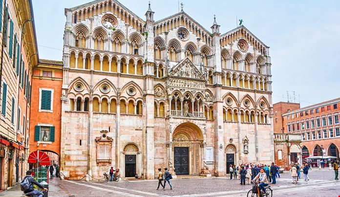 Il Duomo di Ferrara, ufficialmente Basilica Cattedrale di San Giorgio, si trova nel centro storico, non troppo lontano dal Castello Estense. Il campanile rinascimentale, rimasto incompiuto, è splendido in marmo bianco e rosa.