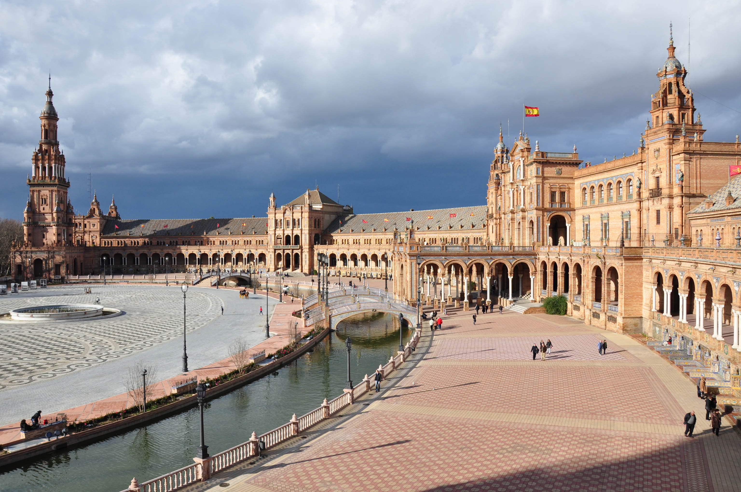 Plaza de España, una stupefacente costruzione semicircolare di 50.000 metri quadrati all’interno del Parco Maria Luisa, dal cui balcone si può godere un panorama meraviglioso. Al centro della piazza si trova una grande fontana circondata da un canale.