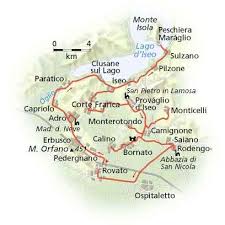 La Franciacorta è una area in che si estende tra Brescia e la parte sud del Lago di Iseo, una zona caratterizzata da un microclima e terreni coltivati, e famosa per la sua industria viticola. Tutte le strade sono segnate da sentieri sia su strade che sulle mappe.