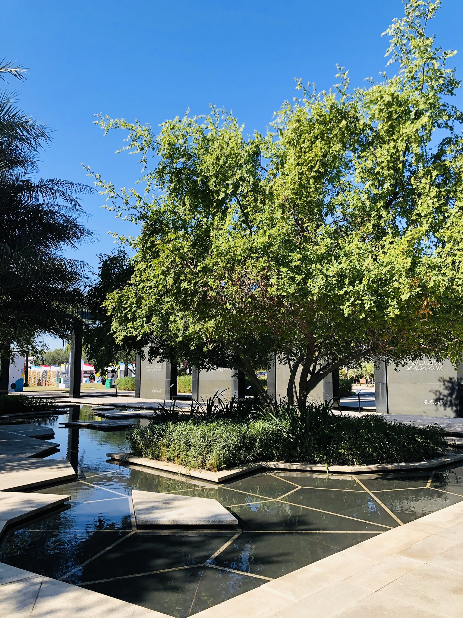 File di palme conducono a giochi d’acqua che evocano un’oasi artificiale, il tutto realizzato come una fontana contemporanea. Il parco ospita diversi siti, tra cui un anfiteatro, giardini, un parco giochi e una stalla per animali. Particolarmente bello è il Giardino della saggezza, con piante autoctone ben curate e lastre di marmo con citazioni del defunto sceicco Bin Sultan Al Nahyan.