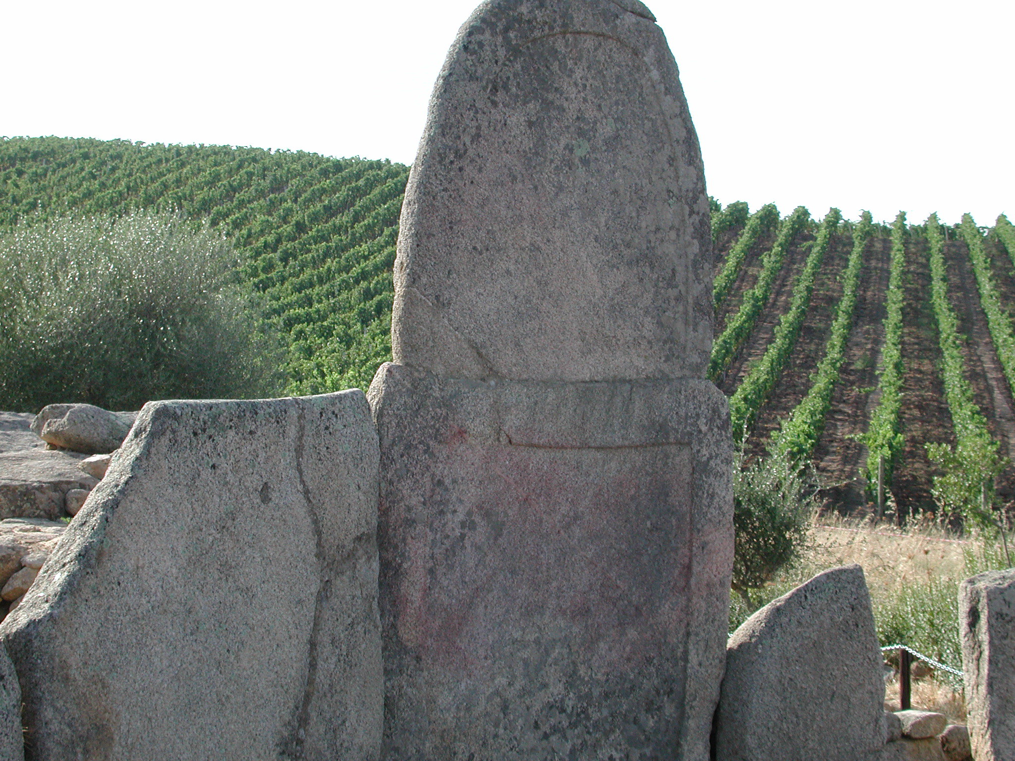 Invece, la parte frontale della struttura è delimitata da una sorta di semicerchio, quasi a simboleggiare le corna di un toro. Inoltre, nelle tombe più antiche, al centro del semicerchio è posizionata una stele alta in alcuni casi fino a quattro metri. In genere, la stele è finemente scolpita e fornita alla base di una piccola apertura che pare venisse chiusa da un masso.